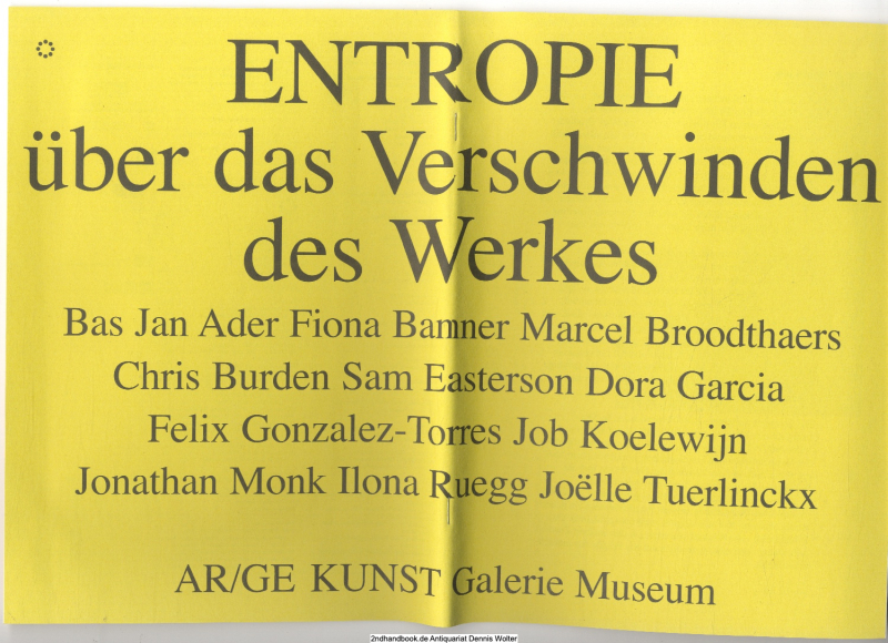 [96] S. : Ill. ; 27 cm, 150 gr., geheftet. Text dt., engl. und ital. Der anlässlich der gleichnamigen Ausstellung in der Galerie Museum in Bozen entstandene Katalog »Entropie: über das Verschwinden des Werkes« dokumentiert Projekte von elf internationalen Künstlern, in denen die geläufige Vorstellung des Kunstwerks als ein für die Ewigkeit geschaffenes, nicht mutierbares, messbares und physisches Objekt untergraben wird. Die gezeigten Arbeiten von Bas Jan Ader, Fiona Banner, Marcel Broodthaers, Chris Burden, Sam Easterson, Dora Garcia, Felix Gonzalez-Torres, Job Koelewijn, Jonathan Monk, Ilona Ruegg und Joëlle Tuerlinckx verweisen in ihrer Konzeption auf die Idee des Veränderlichen und Vergänglichen und sind in ihrem prozesshaften, ephemeren Wesen auf das eigene Verschwinden hin ausgerichtet. Der Katalog enthält Texte vom Kurator der Ausstellung, Moritz Küng, und von Franz Xaver Baier, Professor für Architektur an der Fachhochschule München. Kontaktdaten des Herstellers: Revolver - Archiv für aktuelle Kunst, Fahrgasse 23, 60311 Frankfurt/Main