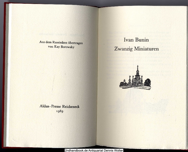 43 S. ; 21 cm, Orig.-Leder im Orig.-Pappschuber. Ausgabe der Aldus-Presse Reicheneck ; 40. Aus d. Russ. übertr. von Kay Borowsky. Diese zwanzig literarischen Miniaturen Ivan Bunins entstanden zwischen 1913 und 1930. Sie erscheinen hier zum erstenmal in deutscher Sprache. Handsatz aus der Baskerville Korpus und Handdruck erfolgten als 40. Ausgabe der Aldus-Presse Reicheneck bis zum Sommer 1989 durch Arno Piechorowski. Die Bilder und Vignetten schuf Zbigniew Dolatowski. Es wurden 88 numerierte Exemplare abgezogen, und zwar die Nummern 1-55 auf handgeschöpftem Tovil-Papier von Barcham Green und die Nummern 56-88 auf 125g Zerkall Büttendruckpapier. Davon ist dies die Nummer 37. Signatur von Piechorowski.