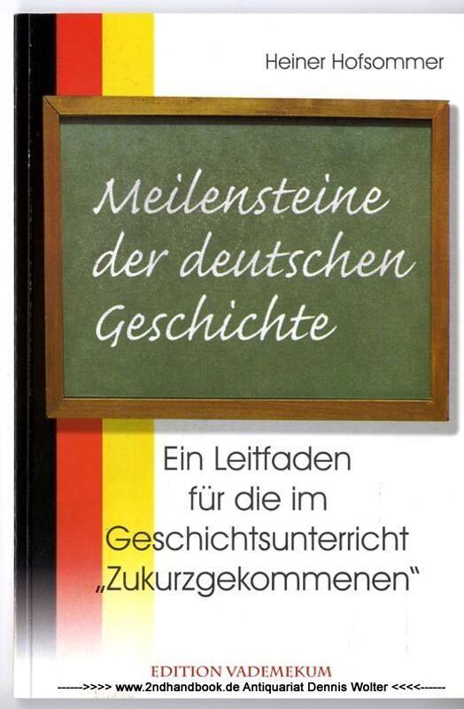 111 S. ; 21 cm, 170 gr., Orig.-kart. Hintere obere Ecke knickspurig. Die vorliegende Abhandlung bietet eine in klarer Sprache abgefaßte, ungemein eingängige Zusammenschau der politischen Geschichte Deutschlands von den Anfängen bis in die Gegenwart. Hier äußert sich keiner jener nachgeborenen, moralisierenden Besserwisser, die in Schulen und Universitäten mit erhobenen Zeigefingern dozierend, willentlich oder aus Unwissenheit, der dauerhaften Neurotisierung des deutschen Volkes Vorschub leisten. Der Autor beschreibt und erläutert in prägnant-knapper Form die wesentlichen Entwicklungsstufen und Zusammenhänge und legt überzeugend dar, daß die deutsche Geschichte erheblich mehr ist als eine Kette von Fehlern, Irrtümern und Katastrophen, sondern im Gegenteil zur Identifikation einlädt. Eine reiche Lebenserfahrung und ein natürlicher historischer Verstand befähigen hier zu einem Rückgriff, der dem vergangenen menschlichen Leben Gerechtigkeit widerfahren läßt und zeitgebundene Konstrukte als unhistorische Verkürzungen in Frage stellt. Durch die Verwendung einer Vielzahl direkter Zitate gewinnt insbesondere die Darstellung der neueren Geschichte sehr stark an Lebendigkeit. Deutungsmöglichkeiten werden ausgeführt, die die gewöhnlichen Absolventen bundesrepublikanischer Bildungsanstalten zum Nachdenken anregen dürften und neue Suchbewegungen auslösen könnten. Die abschließende weltanschauliche Selbstverortung des Autors, die mit einer kritischen Bestandsaufnahme des Zustandes unseres Landes zusammenfällt, macht das Buch in seiner Konzeption und Intention zu einem wirklichen Unikat. Dabei wird augenfällig, daß Tagespolitik und Geschichtsdeutung aufs engste miteinander verwoben sind. Nur wenn es uns gelingt, den Mißbrauch der Geschichte zu politischen Zwecken zu beenden und uns aus einer selbst verschuldeten Unmündigkeit zu befreien, werden wir die erforderliche politische Gestaltungsfähigkeit wiedererlangen und die Zukunft dieses Landes sichern können. Heiner Hofsommer hat mit den "Meilensteinen" zweifellos einen wertvollen Beitrag zu dieser notwendigen Rückgewinnung der Geschichte geleistet. (Björn Höcke)