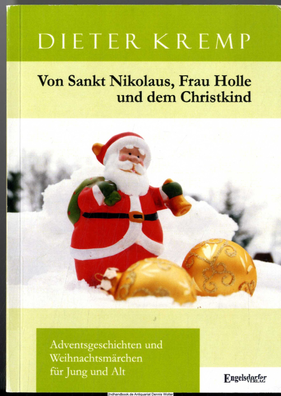 192 S. ; 21 cm, Orig.-kart. Ecken leicht bestoßen, Kopfschnitt mit Fleck, mit Tipp-Ex übermalter Besitzeintrag. In diesem Buch erzählt Dieter Kremp insgesamt 30 Adventsgeschichten und Weihnachtsmärchen, in denen es um allerlei wundersame Märchengestalten in der Weihnachtszeit geht. Sankt Nikolaus und das Christkind spielen in seinen Märchen immer wieder die Hauptrolle, aber auch Knecht Ruprecht und die Schneefee Frau Holle sind in viele Geschichten eingebettet. Auch der uralte Wetterheilige Sankt Petrus, der ja zusammen mit Frau Holle für den Schnee im Winter verantwortlich ist, kommt in den Geschichten vor. Nicht nur Sankt Nikolaus und das Christkind bescheren die Erdenkinder, auch die Himmelsengel kommen an Heiligabend zur Erde hernieder. Sogar die Tiere auf dem Bauernhof feiern zusammen mit dem Christkind und mit den Wolkenschäfchen der Frau Holle das Weihnachtsfest. Und auch ein feuriges Sternenkind lässt es sich nicht nehmen, von der Himmelsstraße hinunter zur Erde zu fahren. In einem seiner Märchen wird sogar Weihnachten bei Adam und Eva im Paradies gefeiert, wobei der Apfelbaum zum schönsten Weihnachtsbaum geschmückt wird. An den wunderlichen und äußerst heiteren Märchen werden nicht nur die Kinder, sondern auch deren Eltern ihr Vergnügen haben und vollauf begeistert. Kontaktdaten des Herstellers: Hemmann, Tino Engelsdorfer Verlag Schongauerstr. 25 Leipzig 04328 DE info@engelsdorfer-verlag.de